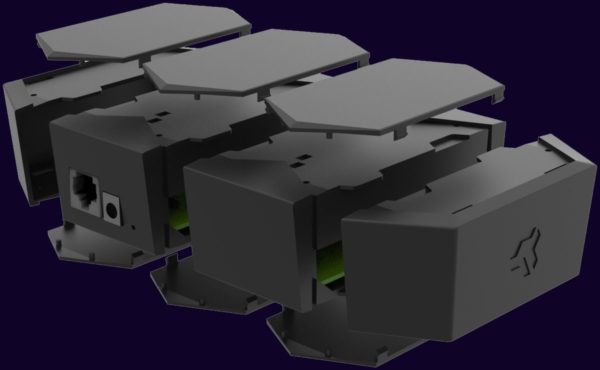 RTMX-N-001-part-005 is a set of two pieces (bottom and top part) of spare connecting plastics in the shape of hexagons, which connect the individual parts/modules of the Turris MOX router.